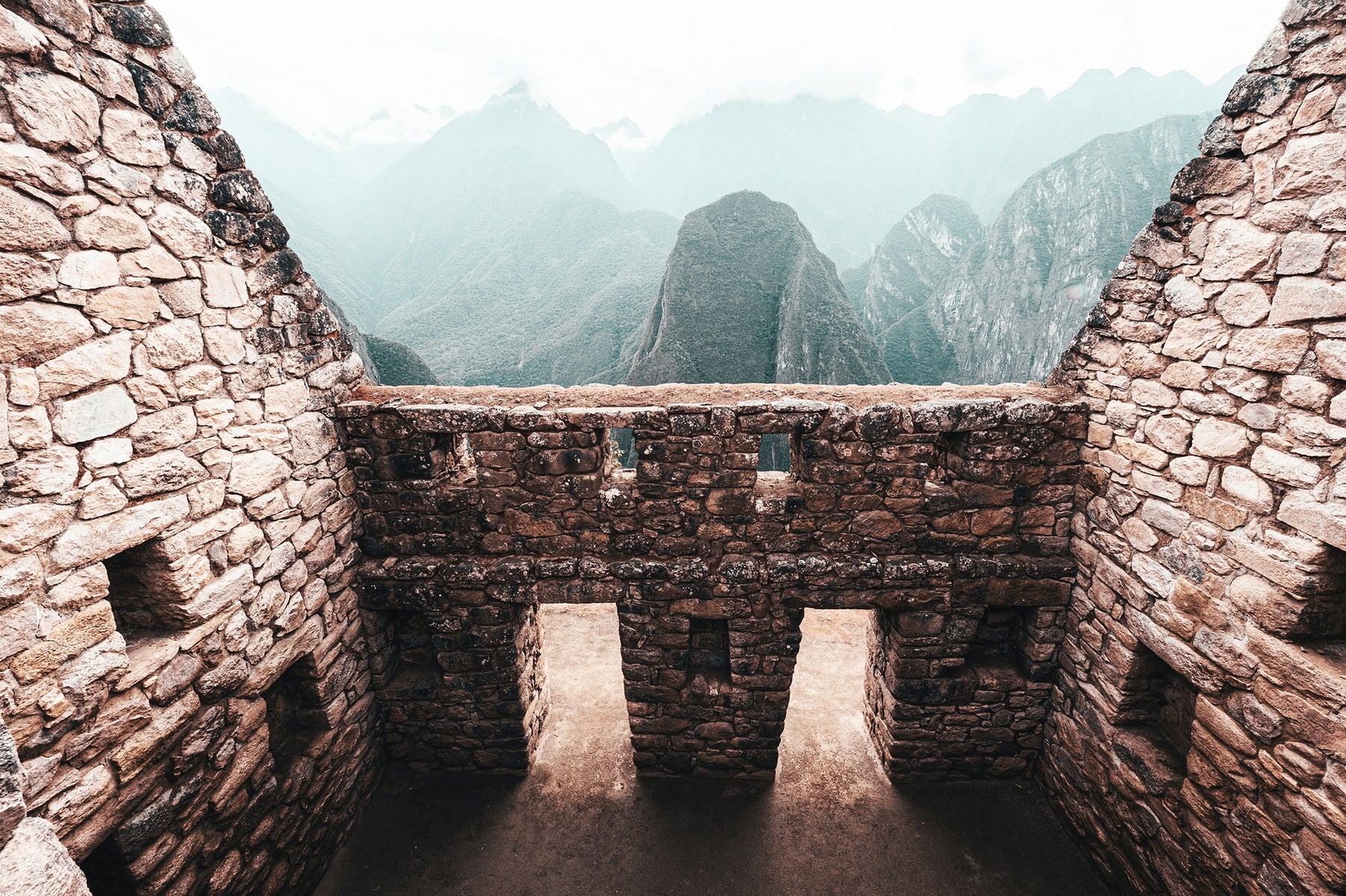 The image showcases the remains of an ancient room at Machu Picchu, set against the breathtaking backdrop of the Andean mountains. The architecture is characterised by its trapezoidal doorways and windows, a hallmark of Incan design, which stand out prominently against the meticulously crafted walls made from irregularly shaped stones fitted together. The foreground displays a room open to the sky, a framed view of the misty, green-clad peaks in the distance, evoking a sense of historical wonder and the advanced masonry of the Inca civilisation.