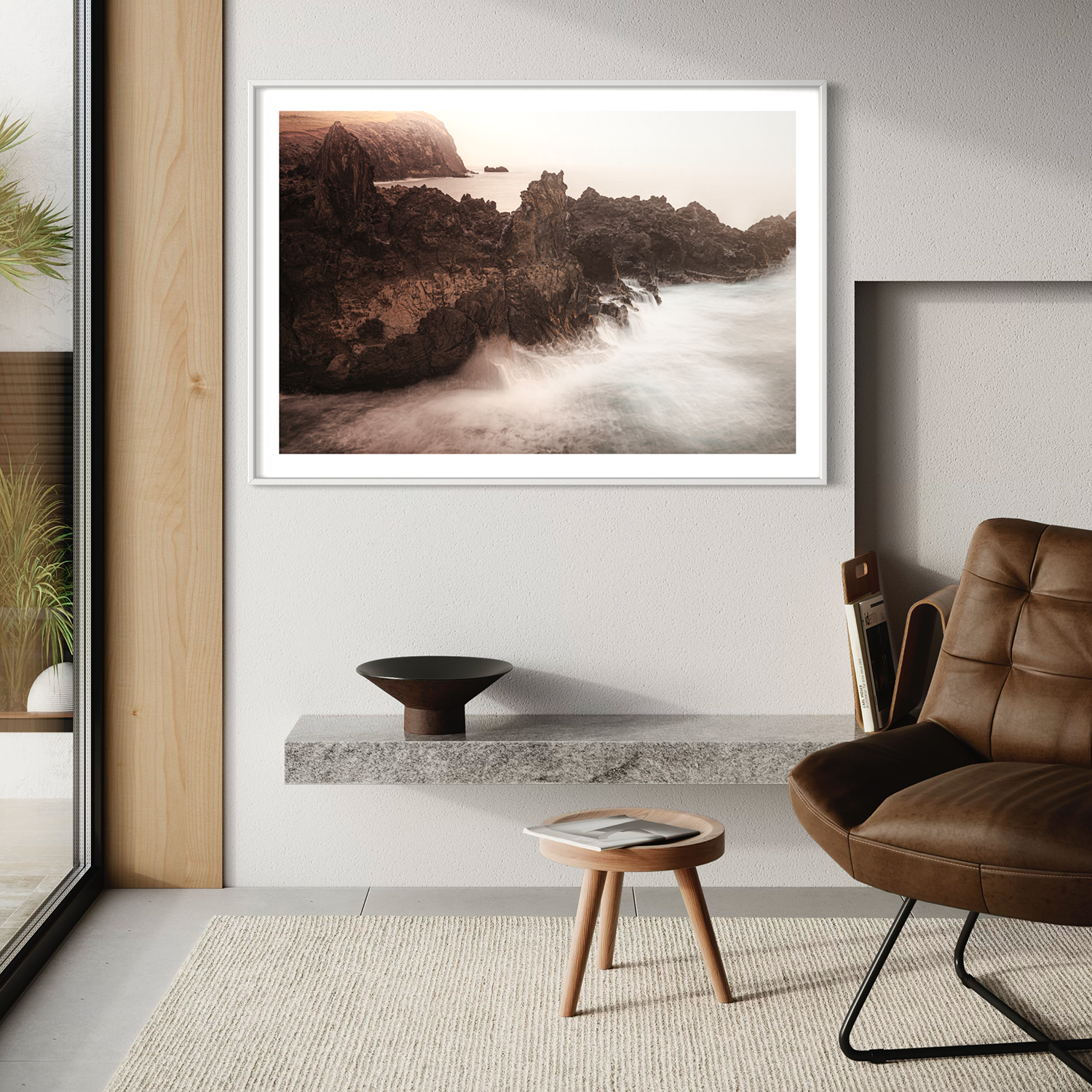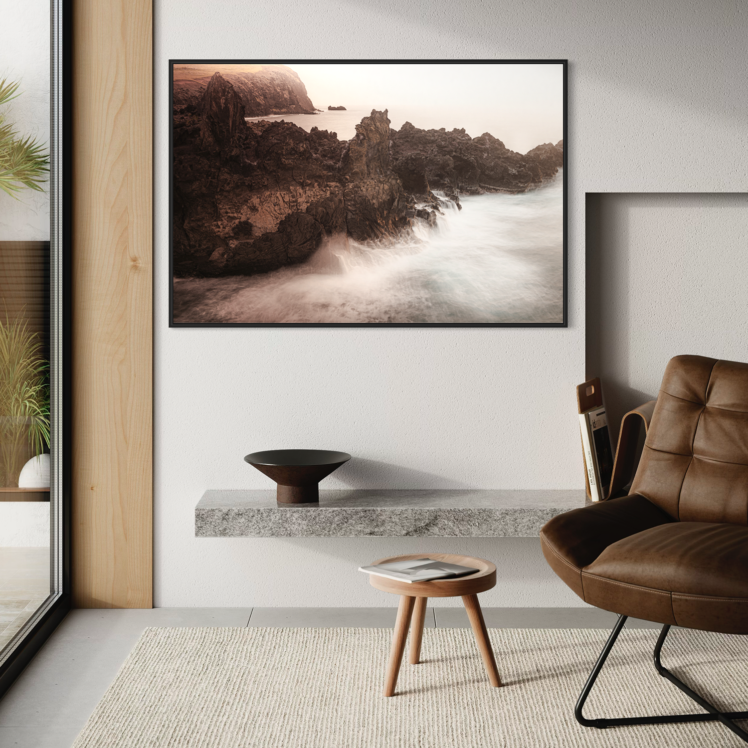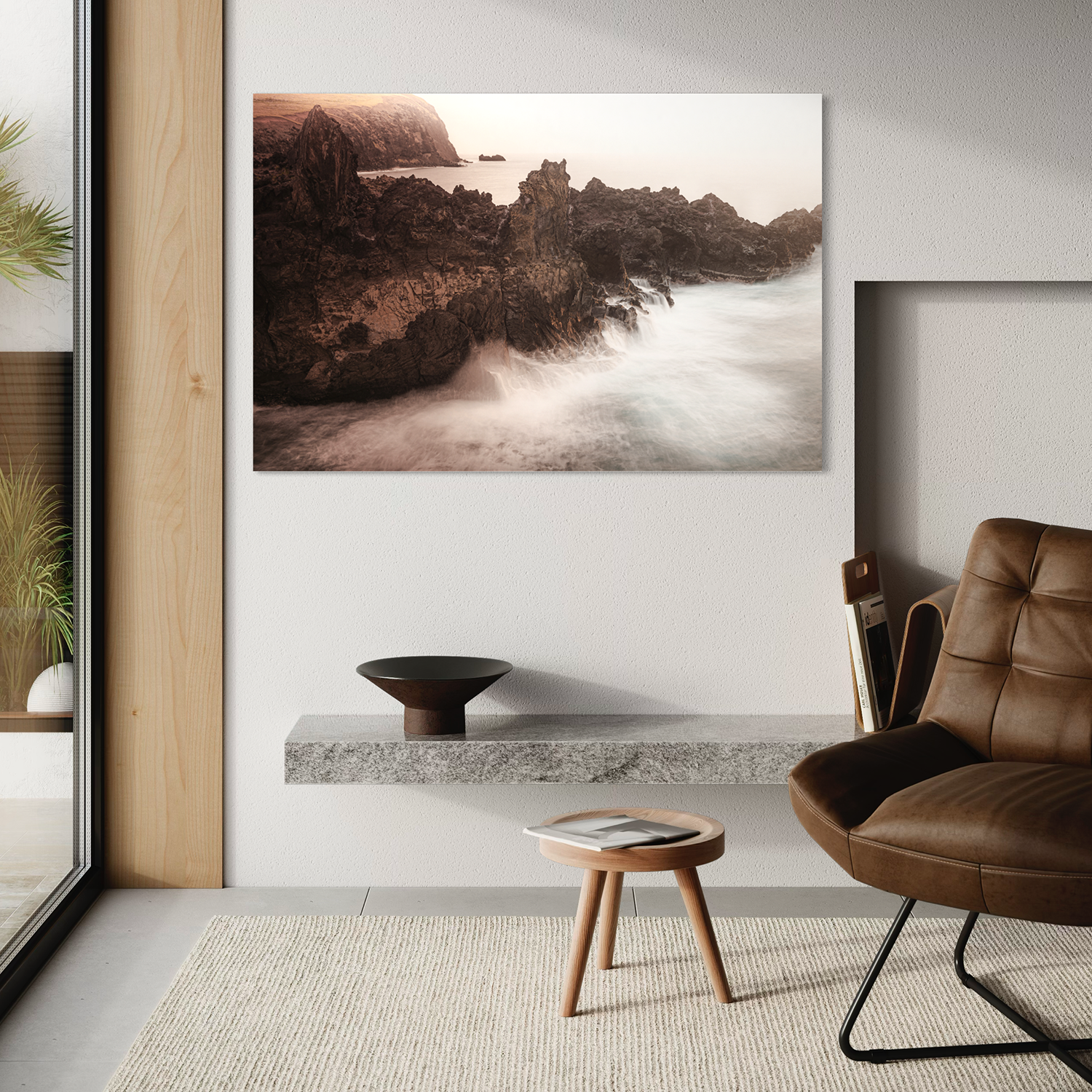 The photograph captures a dramatic coastal scene using long exposure photography, which creates a soft, ethereal quality to the waves as they crash against the jagged rocks. The long exposure has turned the water into a milky, ghostly veil that flows over and around the dark, textured volcanic rock formations. The coastline bends away into the distance under a hazy sky, hinting at a rugged landscape beyond.