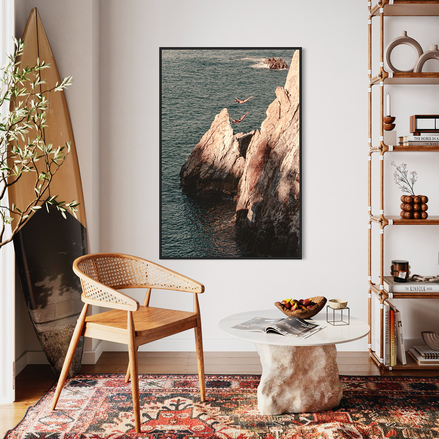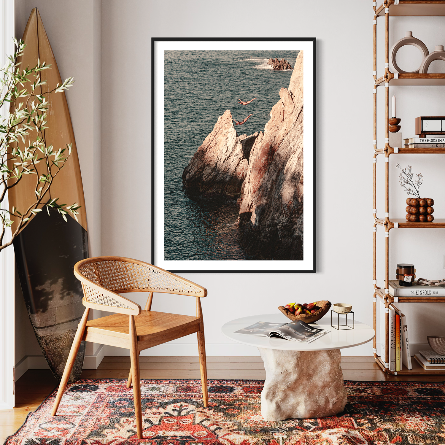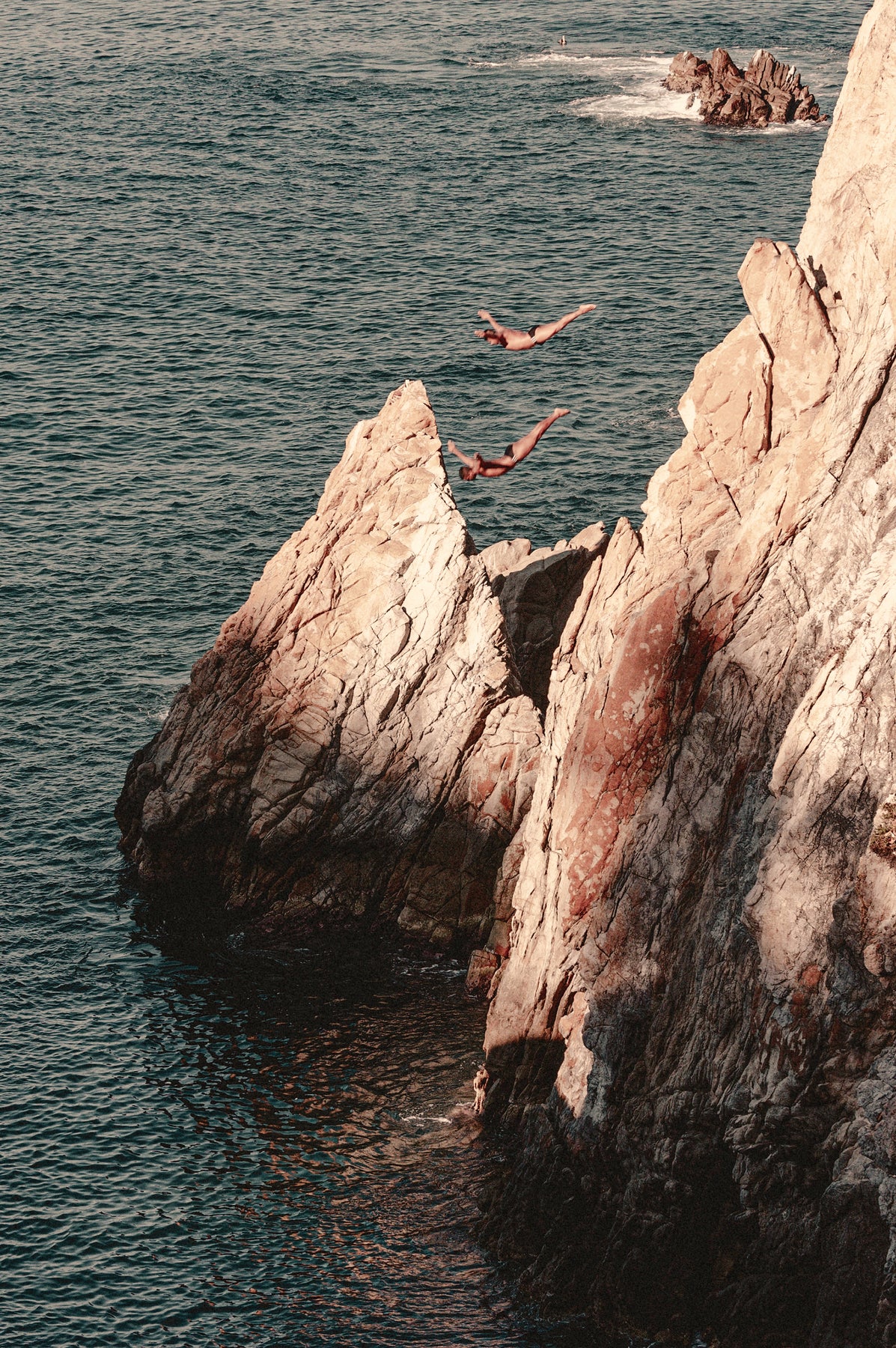 The photograph captures the thrilling moment of Acapulco's iconic cliff divers in mid-descent, their bodies suspended in the air against the backdrop of the rugged cliffs and the vast ocean. One diver is poised gracefully, arms extended, while the other follows, both embodying the fearless spirit of this daring tradition. The sun casts a warm hue over the scene, accentuating the textures of the cliff face and the gentle ripples of the sea below. The divers, with their synchronized form, appear almost like sculptures animated against the natural elements, while another two divers watching from below, emphasizing the height and the audacity of the leap.