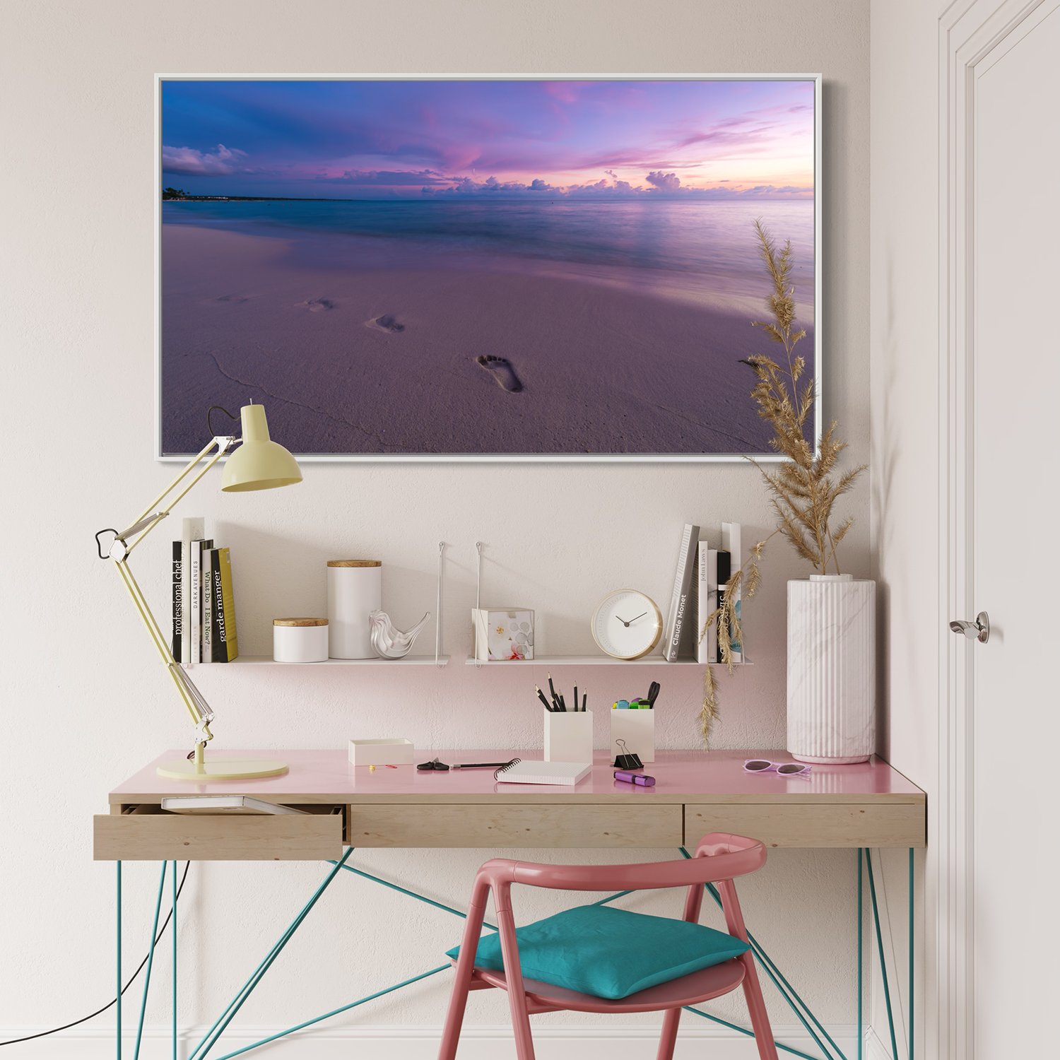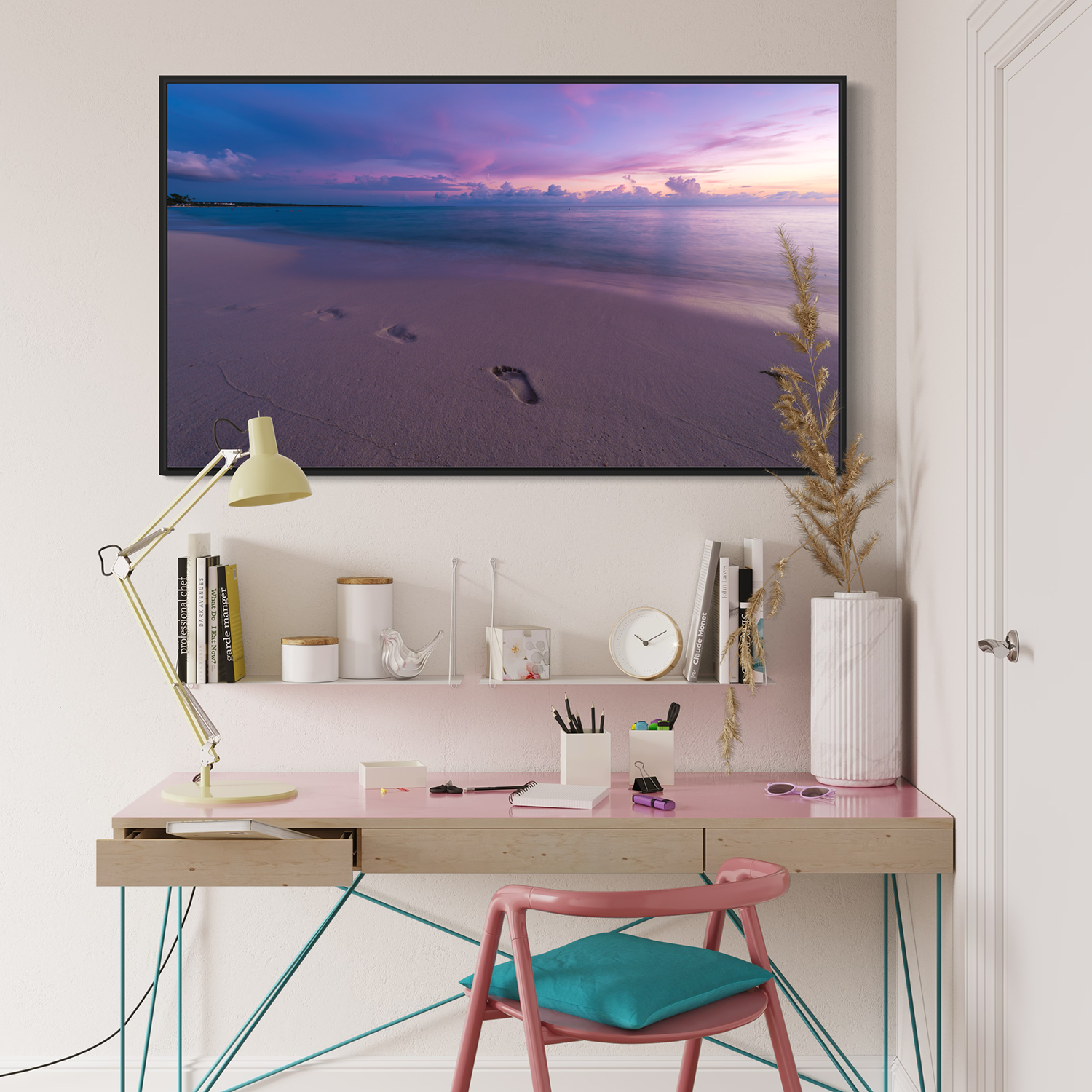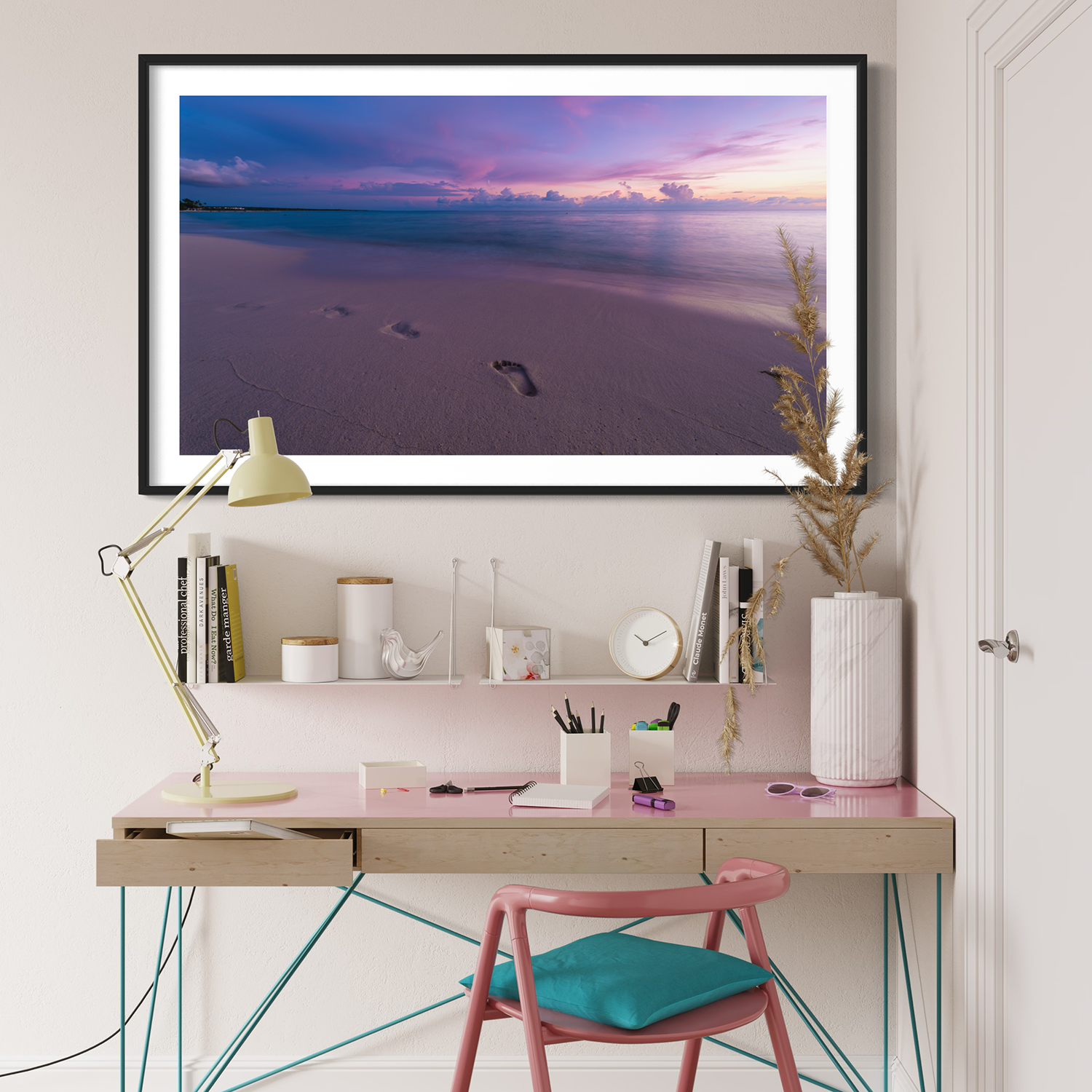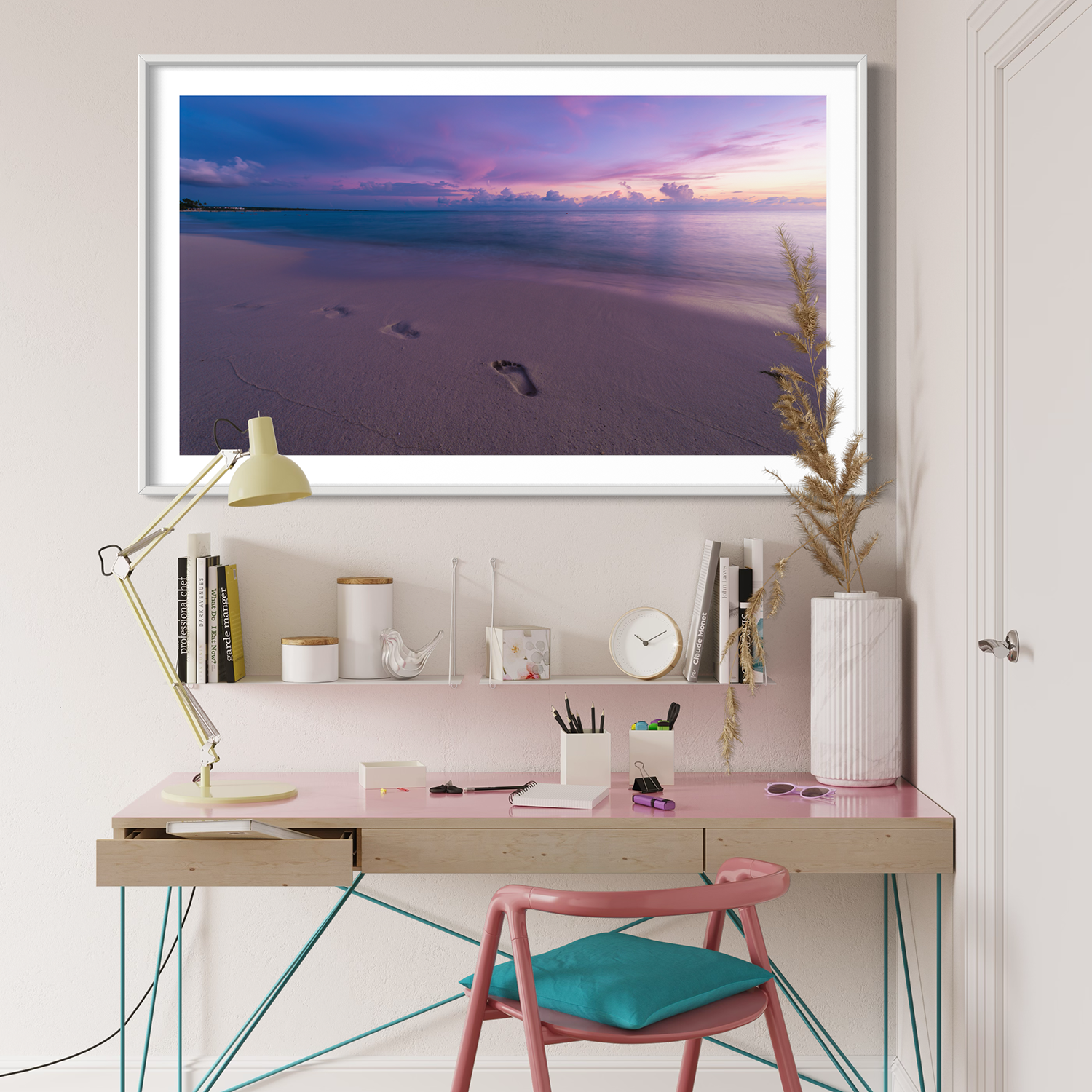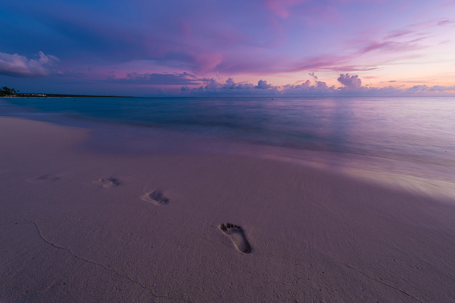 "Forgotten Dreams" is a captivating landscape photo set on the sandy shores of Bayahibe in the Dominican Republic, taken shortly after sunset. The image features a poignant scene where a lone set of footprints is etched into the sand, gradually being erased by the gentle caress of the waves. This fleeting moment symbolizes the ephemeral nature of memories and experiences. Above, the sky is a mesmerizing tableau of stormy clouds, rendered in soft pastel hues of blue and purple, adding a touch of serene melancholy to the scene. The contrast between the transient footprints and the timeless ocean, under the vast, color-infused sky, creates a profound sense of reflection and longing, perfectly encapsulating the essence of forgotten dreams.