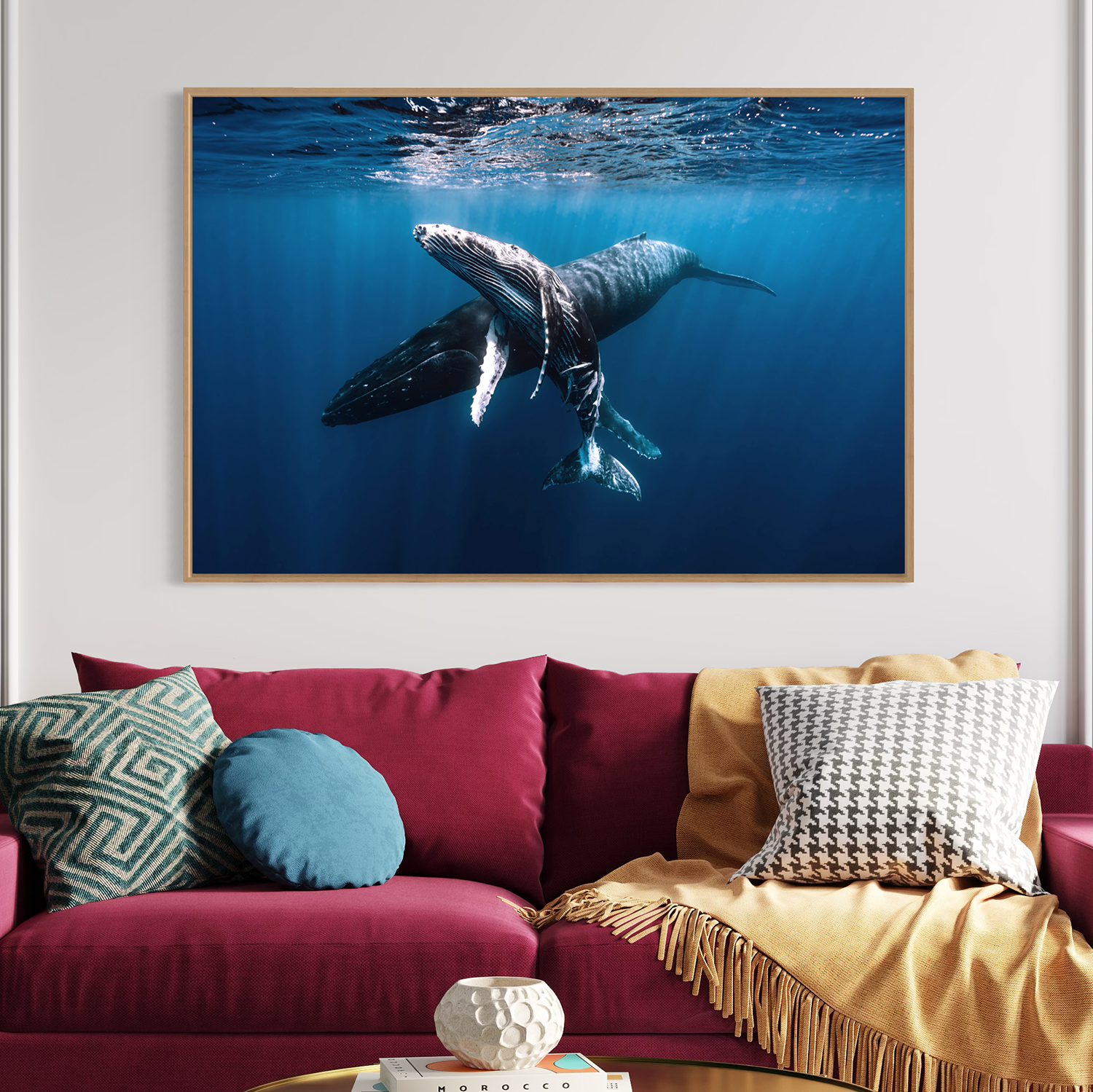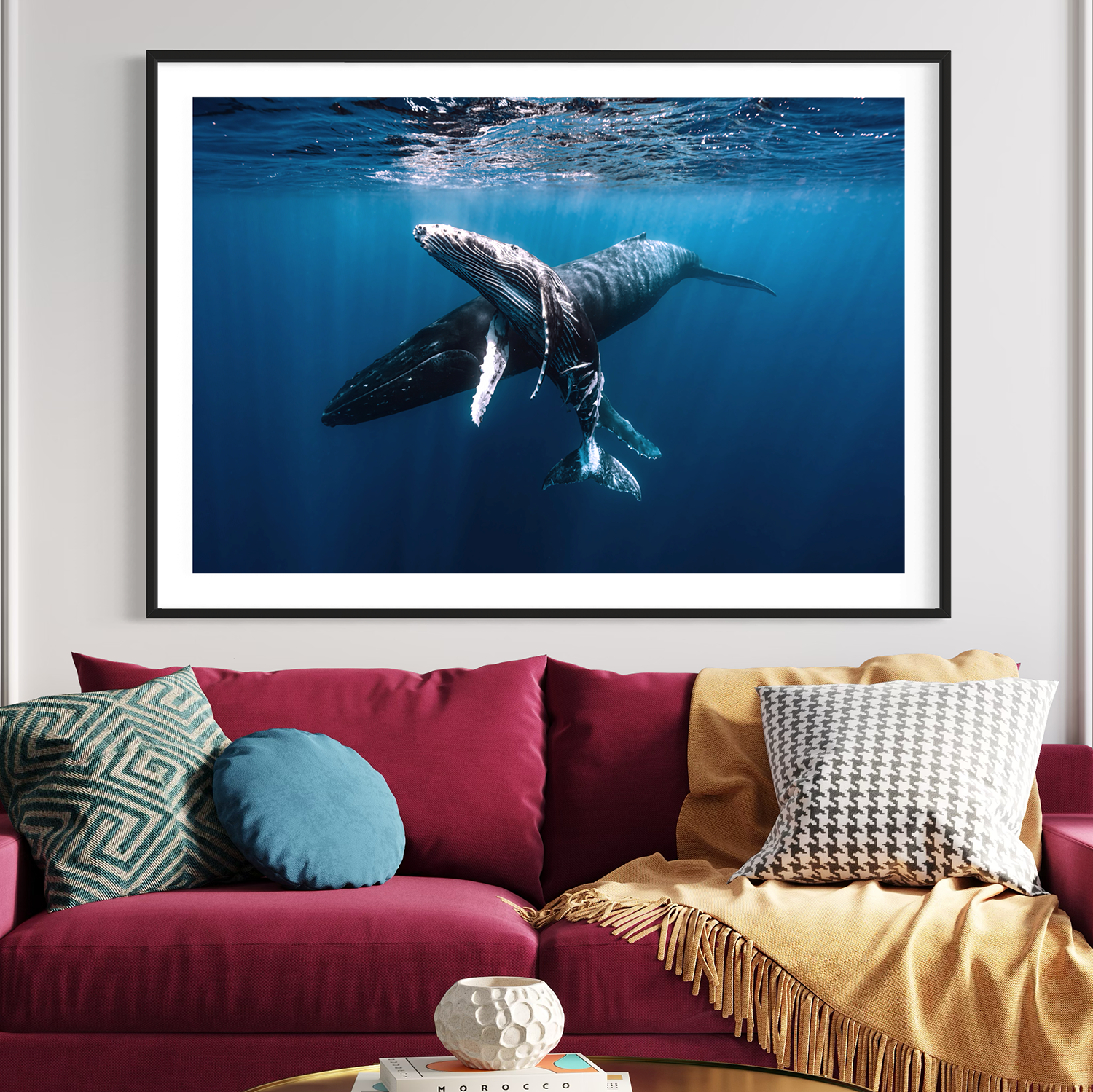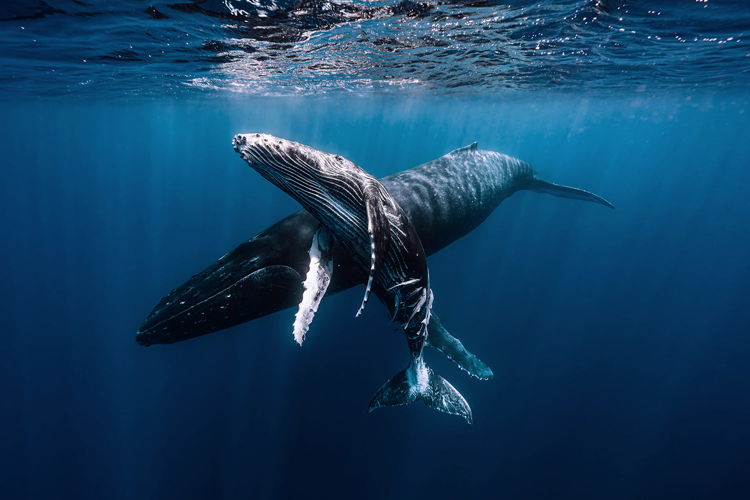 The mother whale, with her massive body casting shades of grey and black, glides through the water with a grace that belies her size. Her calf, a miniature replica in form, stays close to her side, under the protective watch of its parent. Above them, the surface of the water shimmers, dividing two worlds, with rays of light piercing through to illuminate their gentle journey. The deep blue of the ocean envelops them in its vastness, creating a scene of profound tranquility and a powerful connection between these magnificent creatures and the world they inhabit.