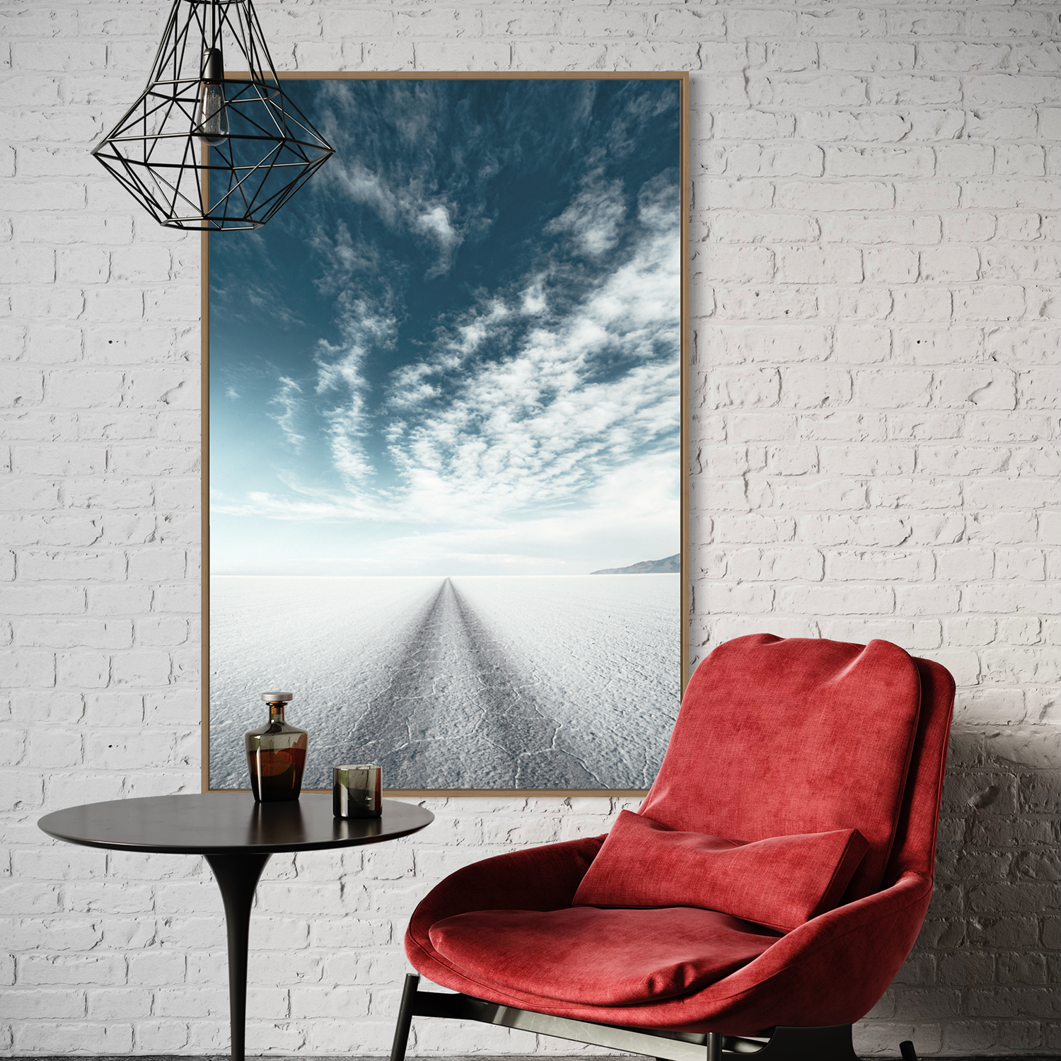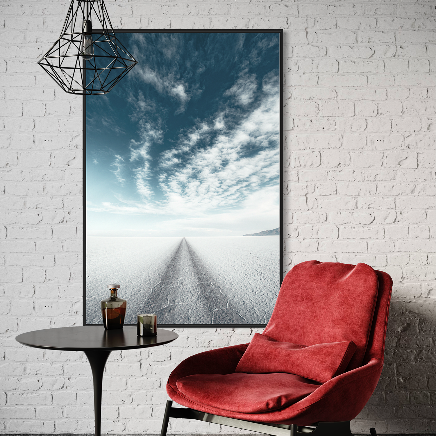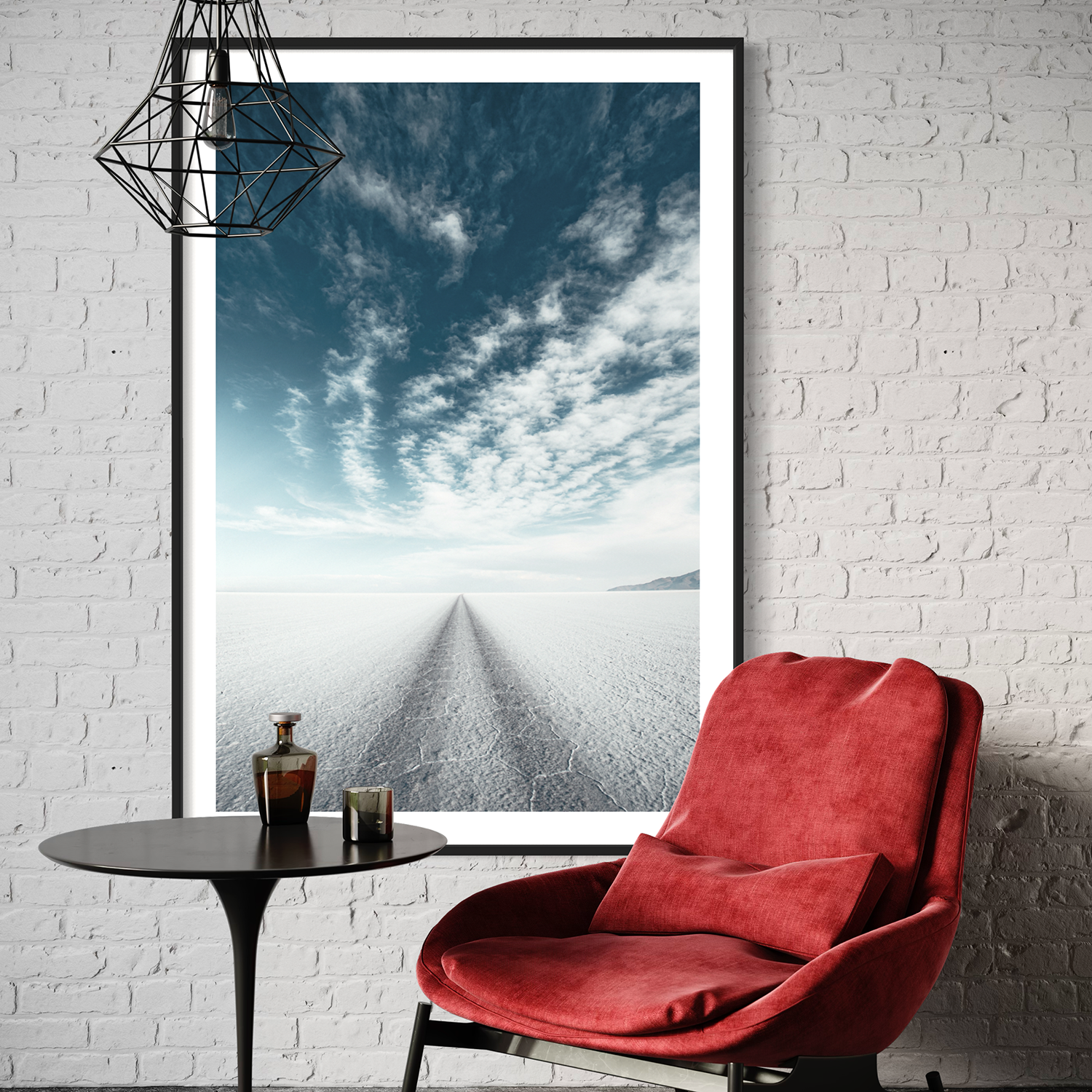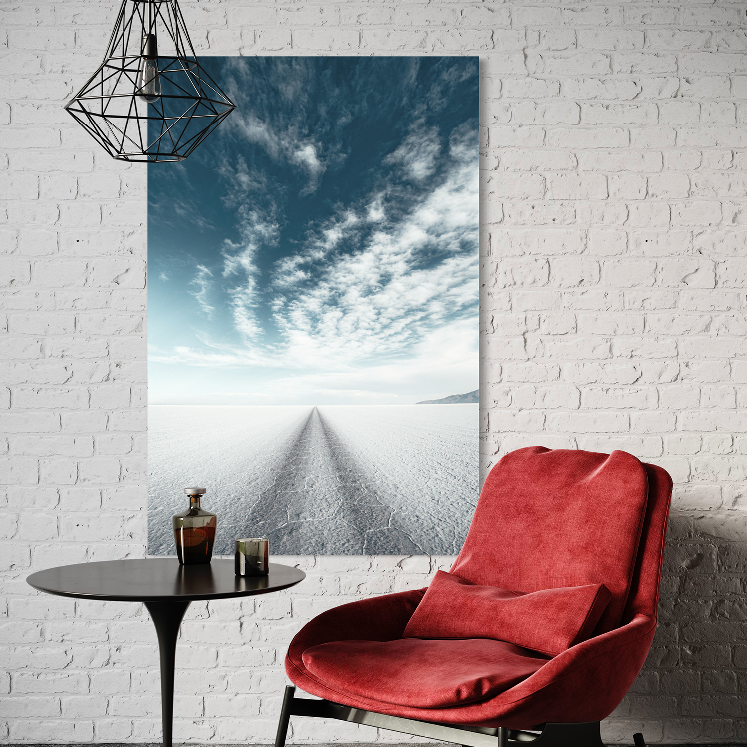 This photograph captures the ethereal beauty of the Salar de Uyuni, the world's largest salt flat, located in Bolivia. The image showcases the vast, flat expanse of the salt crust, which forms a natural white canvas stretching to the horizon. A single set of tire tracks creates a converging perspective, drawing the eye straight towards the vanishing point in the distance, where the white of the salt flat meets the blue of the sky. Above, the sky is adorned with a beautiful array of clouds, ranging from streaks of wispy cirrus to fluffy cumulus, all set against a clear, tranquil blue. The composition of the photo, with its striking contrast between the detailed texture of the salt crust and the soft, painterly sky, evokes a sense of infinite space and surreal tranquility that is characteristic of this unique Bolivian landscape.